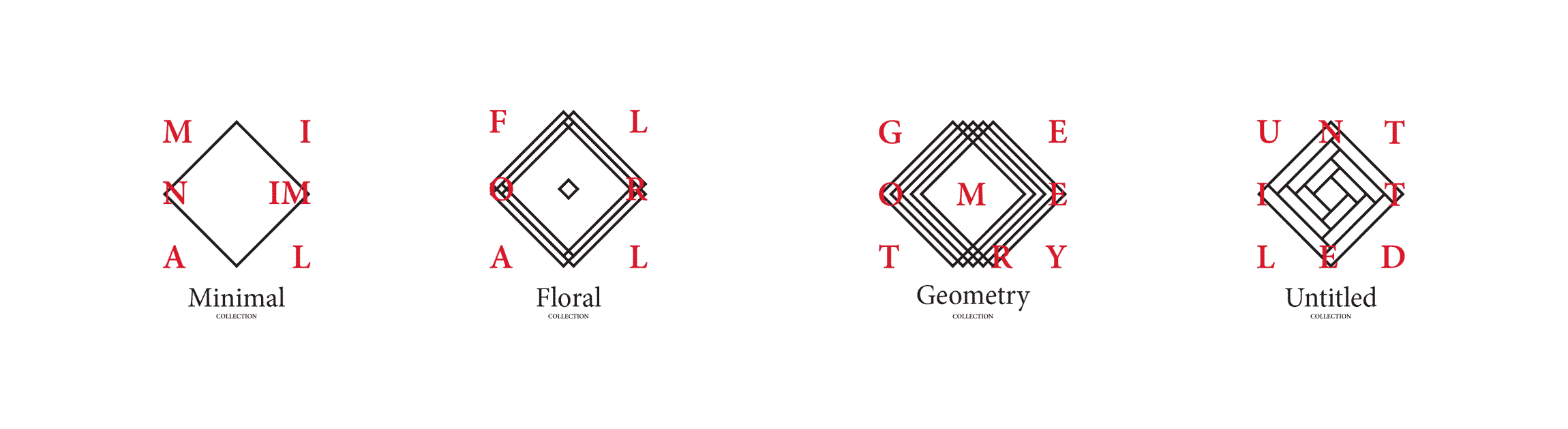 The client needed a unique way to represent their 4 different collections of the rugs. After receiving the philosophy behind each collection, we were able to come up with a solution to solve this problem. We designed four different icons to illustrate each collection. The icons follow the same way of thinking that exists in the core identity of the brand.