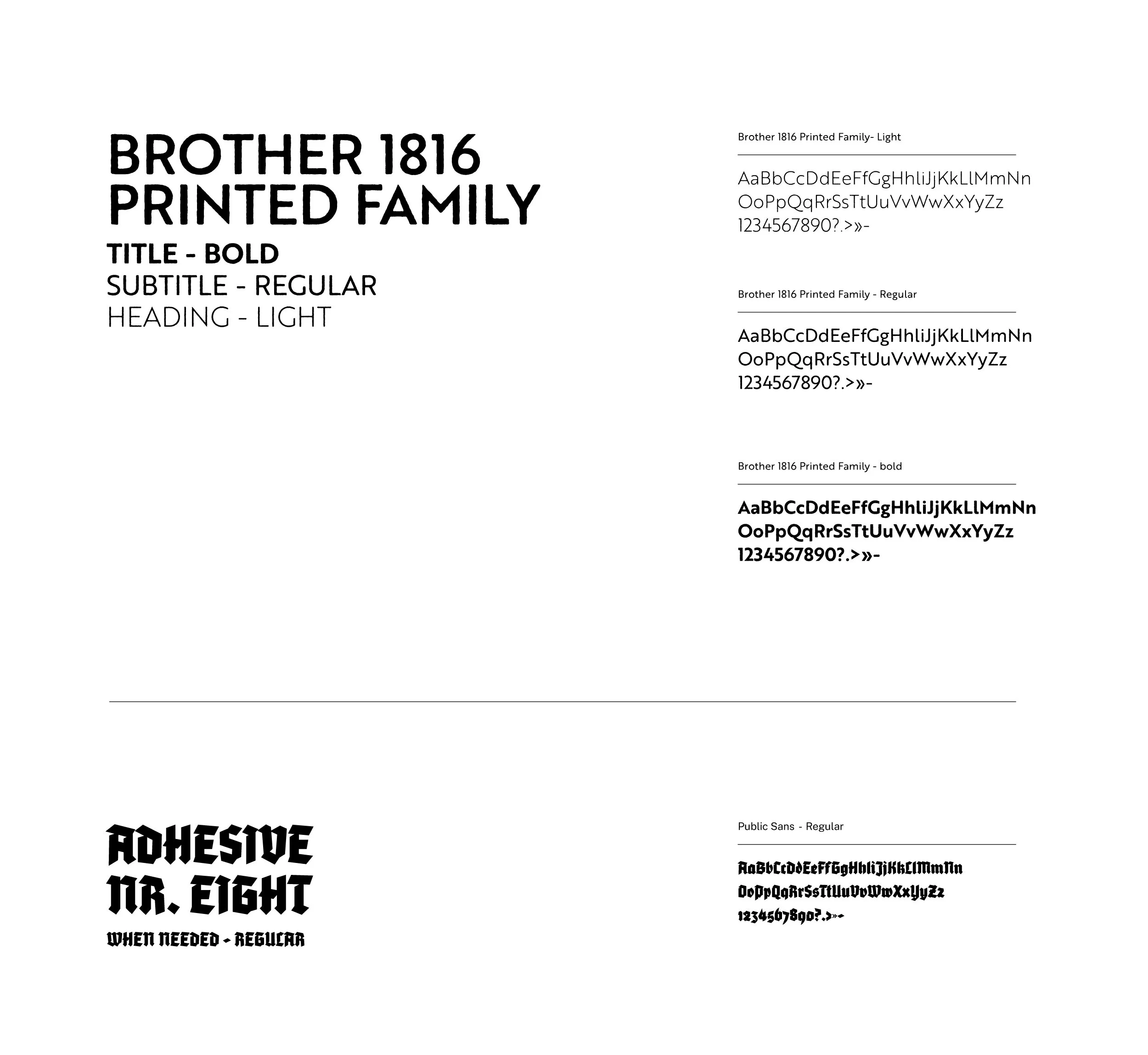 Brother 1816 Printed Family The primary workhorse of the system. Bold weight carries titles and primary headings. Regular handles subheadings, descriptive text, and secondary information. Light is available for refined body applications. The slightly printed texture in the letterforms gives even functional text a sense of place — like something you'd find on a well-designed rum label or a vintage nautical chart.